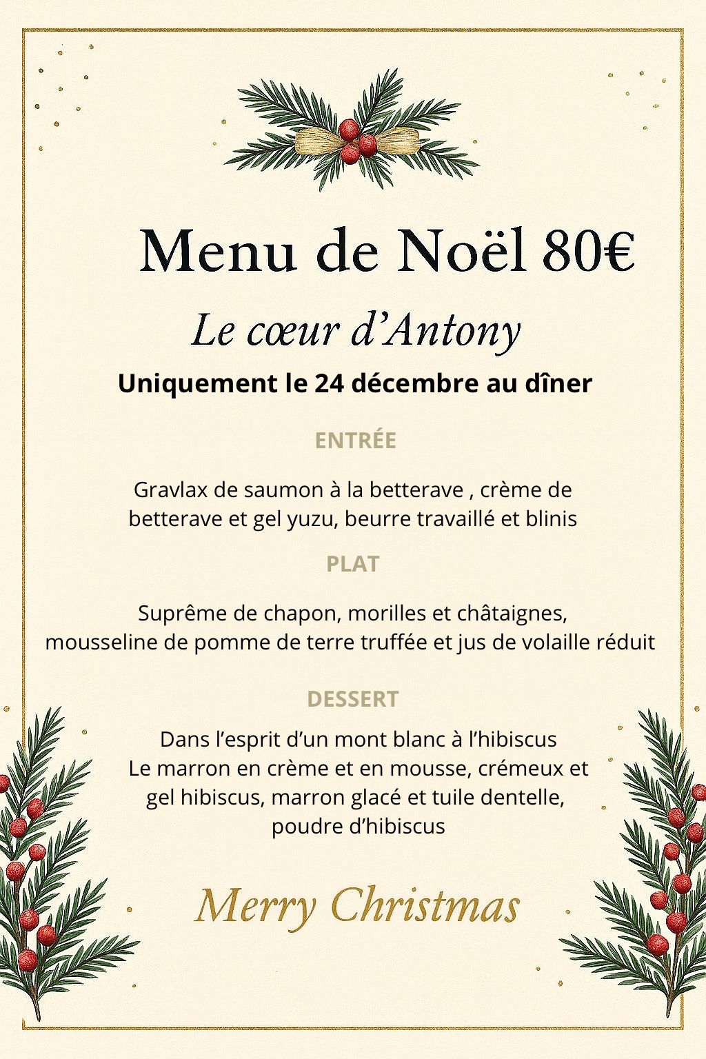 EXCELLENT Basée sur 220 avis Publié sur Jade LaurayTrustindex vérifie que la source originale de l'avis est Google. Incroyablement délicieux, ambiance très sympathique avec le piano. Serveur au top.Publié sur cindy ZinsTrustindex vérifie que la source originale de l'avis est Google. Un grand Merci! Tout était délicieux , les mets, le service et le cadrePublié sur The catTrustindex vérifie que la source originale de l'avis est Google. Une belle découverte pour le Cœur d'Anthony un restaurant bistronomique. Nous avons opté pour le menu de la semaine à 35 € entrée plat dessert un bon rapport qualité-prix. Une cuisine faite avec des produits de qualité bien maîtrisée. La salle est chic dans un cadre feutré. Le service est agréable et sympathique. Nous avons passé un bon moment et nous reviendrons.Publié sur saint-andre claireTrustindex vérifie que la source originale de l'avis est Google. Super soirée ambiance cosi pour moi C'est un resto gastronomique une bonne présentation des assiettes qui met en appétit. Le personnel très discret qui se présente à vos besoins. C'est sur j'y retournerai et pourquoi pas avec des amis pour faire connaître.Publié sur Fatih AkbulutTrustindex vérifie que la source originale de l'avis est Google. Great fine dining experience. I love the duck and the mushrooms starter. Must try!Publié sur sueda selviTrustindex vérifie que la source originale de l'avis est Google. Plat “Le Cèpe” (risotto avec plusieurs sortes de champignons) excellent !!!!!! Dessert "la figue" hyper bon Produits de frais et de qualité De la gastronomie a prix accessible Super soirée, merciPublié sur Laurent S.Trustindex vérifie que la source originale de l'avis est Google. Très belle découverte entre amis à Antony. L'ambiance cosy, sublimée par le piano en musique de fond, des cocktails généreux et surtout des plats bien équilibrés, le tout avec un service agréable. Un très bon moment !Publié sur Romain PotelTrustindex vérifie que la source originale de l'avis est Google. Pour une première ! Ça c’est une très bonne surprise... Accueil agréable et décontracté Service attentionné et impeccable La cuisine très soignée et goûteuse... L’ambiance (samedi soir)agréable, pianiste tout au long de la soirée (pas trop fort)....une bonne expérience....Publié sur Anijah PharamTrustindex vérifie que la source originale de l'avis est Google. Super accueil, saveurs exquis, je recommande à 100%