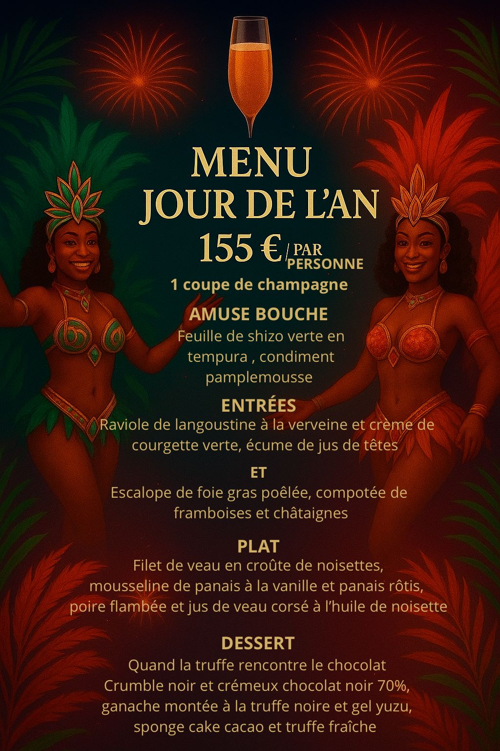 ApéritifCoupe de Champagne Blanc de Blanc Amuse BoucheVerrine de Saint-Jacques au Combava, Crème de Vodka, Caviar Osciètre Entrées Terrine de Foie Gras cuit basse température, Gelée d’hibiscus, Chutney de